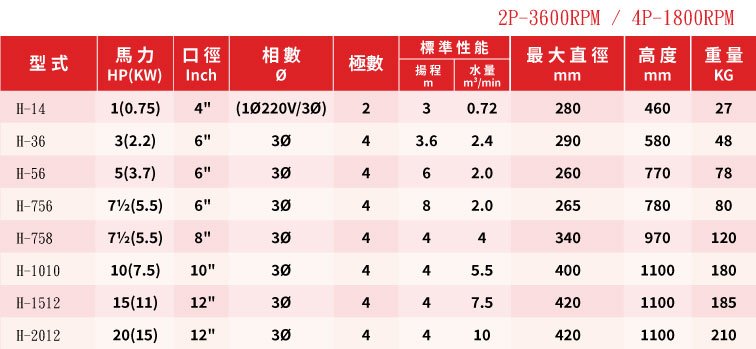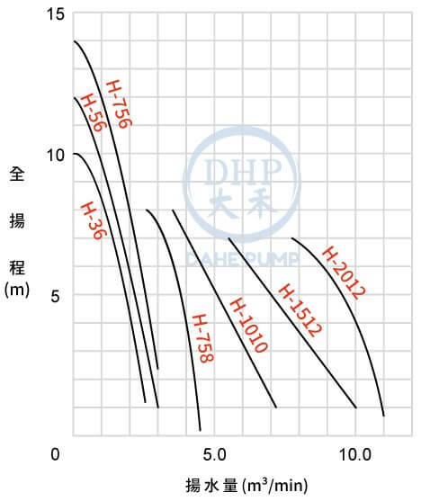 用途 溪水、河川、農業灌溉、養殖魚塭、下水道設備用及其他工業用排水專對大水量排送。 特性 1.軸流式的水流設計,穩定度高、能源省、水量大。 2.操作簡便不需高壓受電設備,符合經濟效益,幾乎無震動及噪音。 3.泵浦機體、馬達外殼,皆以鉋金銅及不銹鋼材質製成堅固耐蝕。 性能曲線